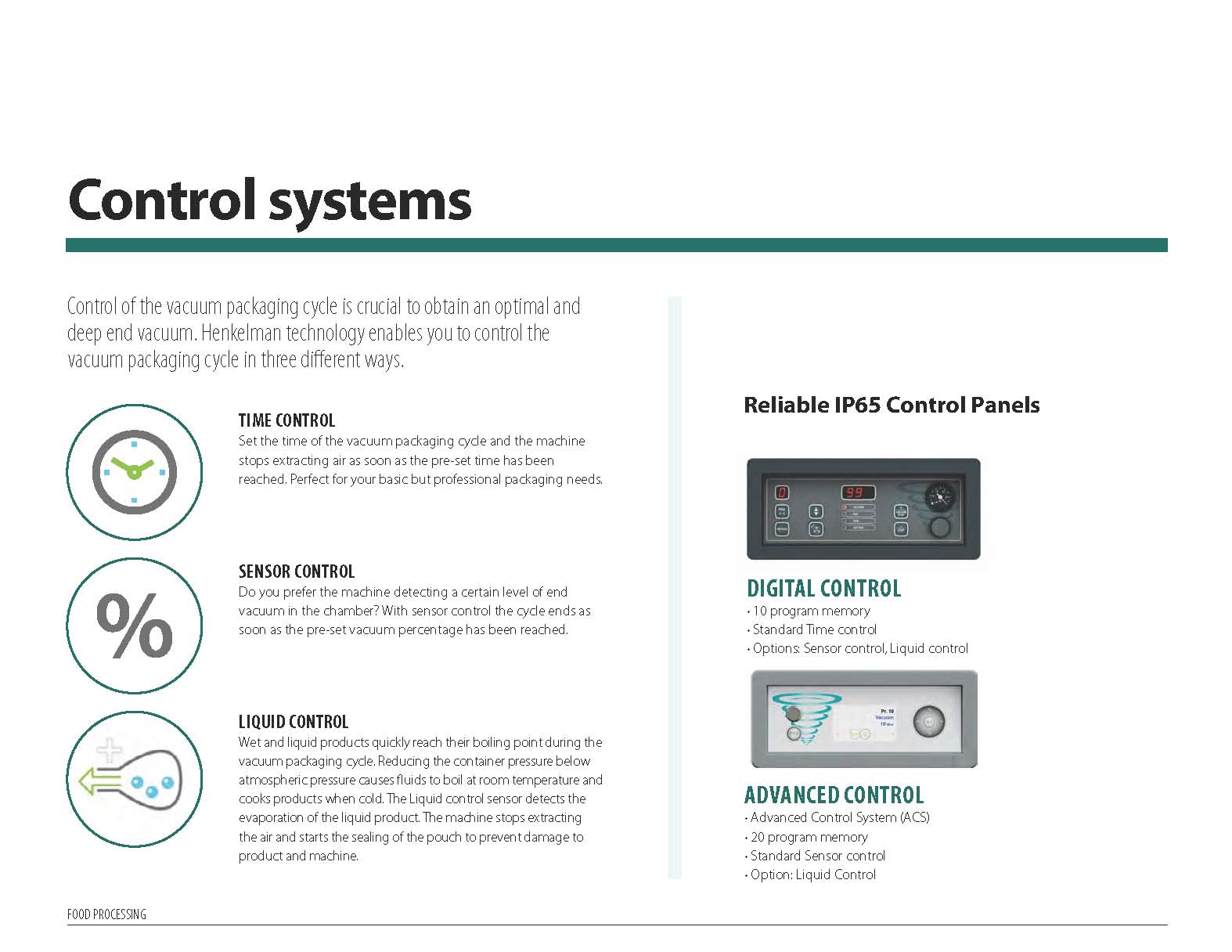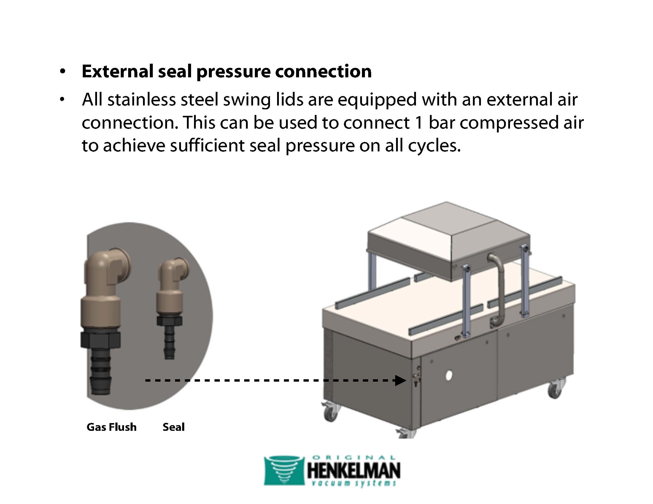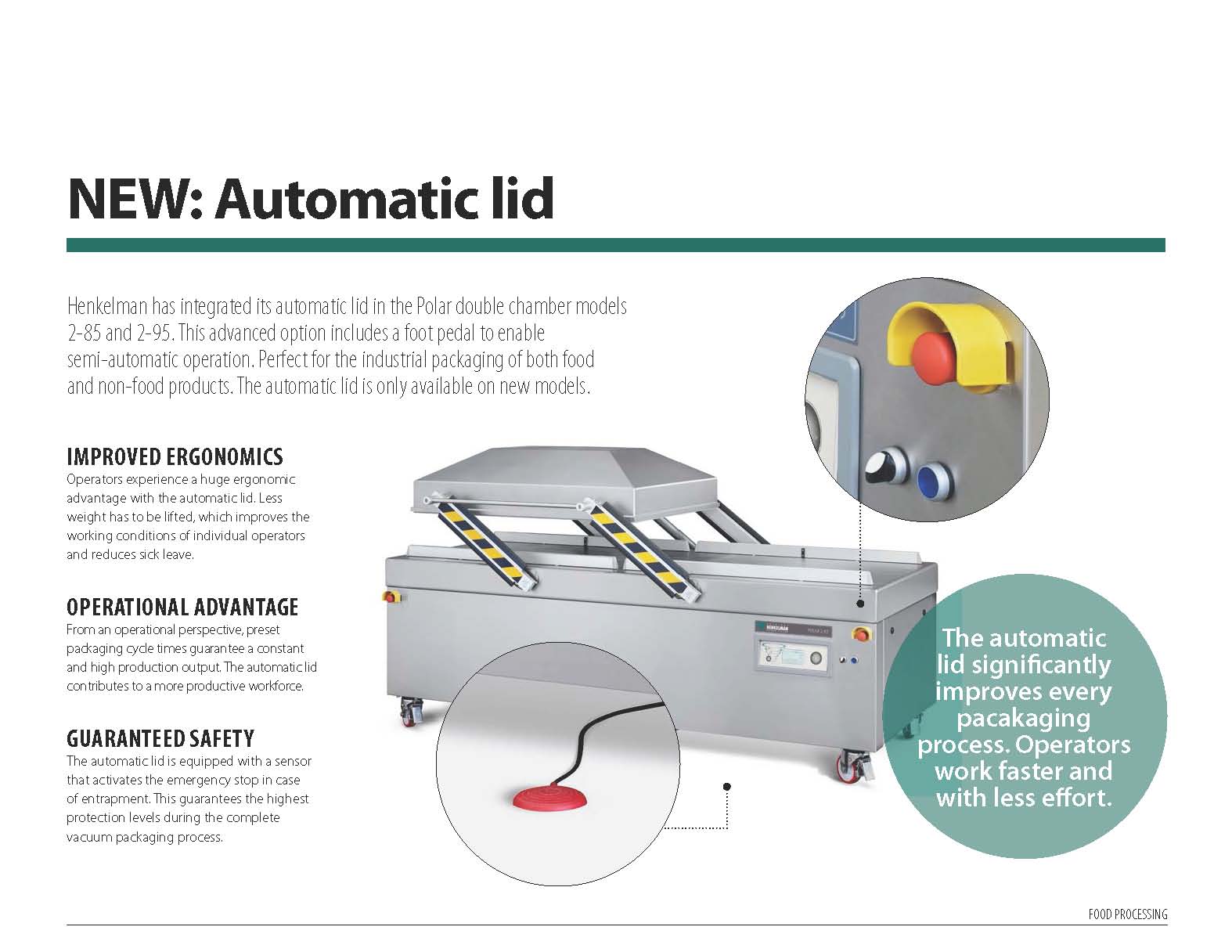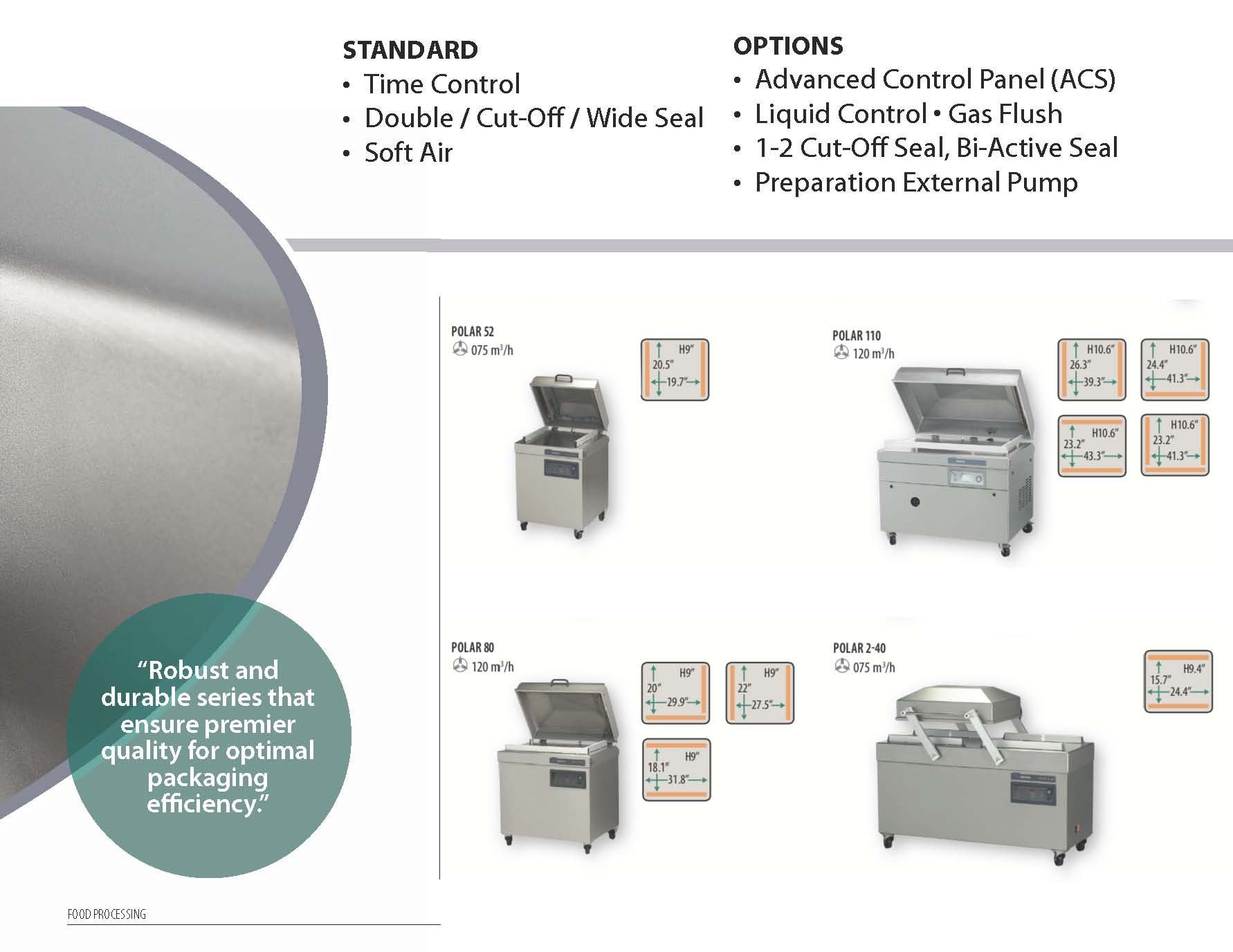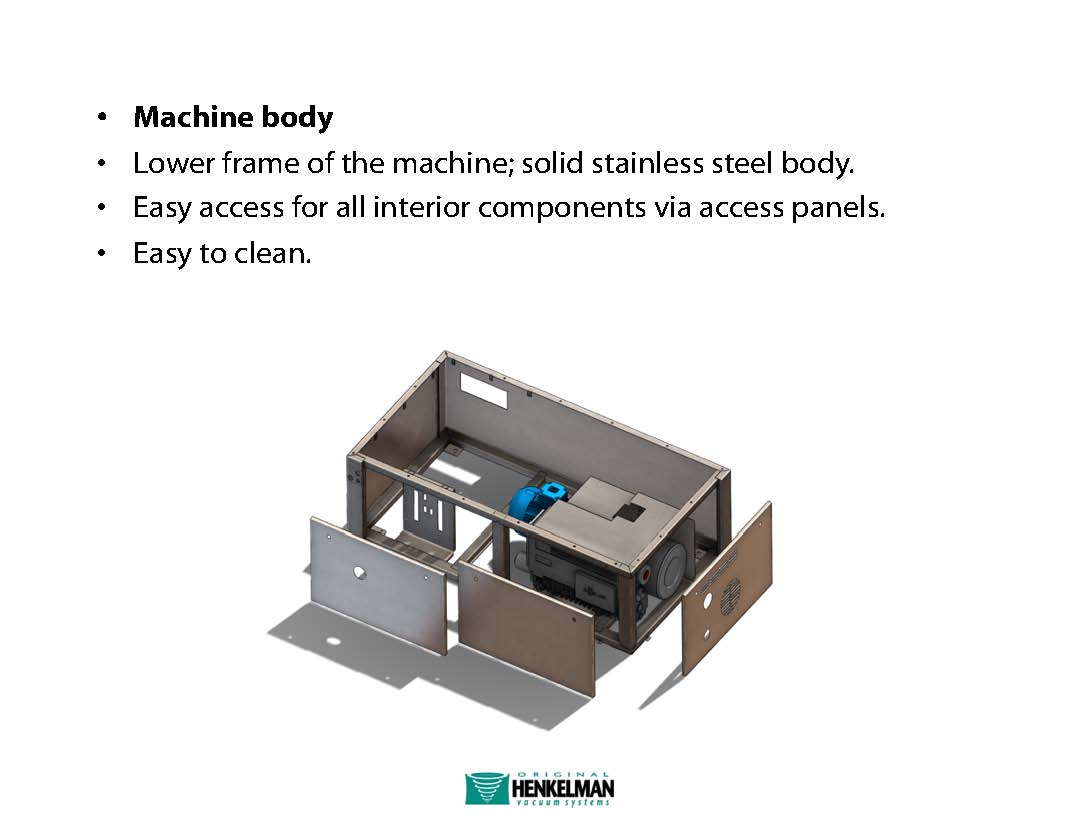 Industrial model made from stainless steel and with double chambers for minimal downtime in the packaging process. Available with different sized chambers. Delivered with 10 programs, flat work plates and soft air.